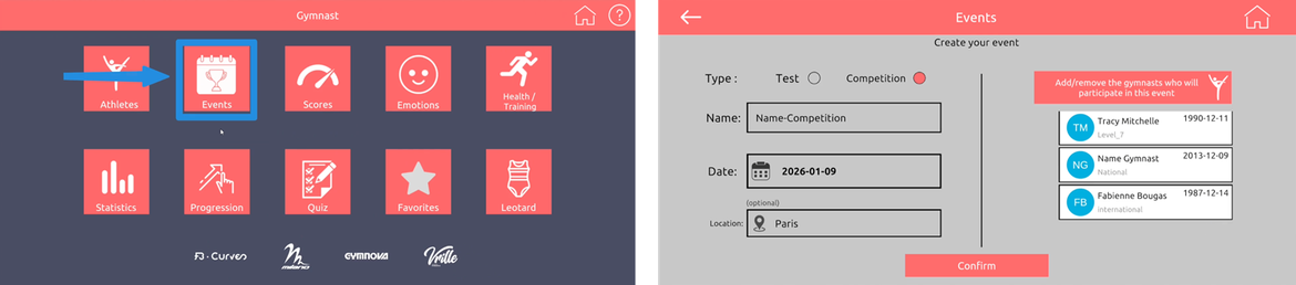 Ajoutez ensuite un test ou une compétition en indiquant le nom, la date et le lieu, puis associez les gymnastes participants.