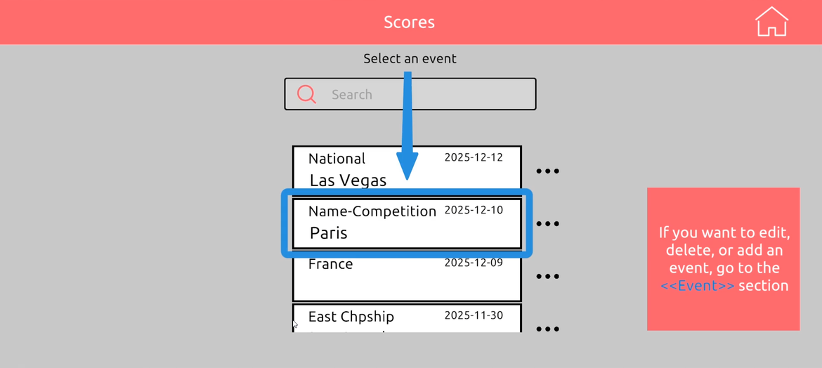 Une fois les athlètes et l’évènement créés, rendez-vous dans l’onglet Scores pour sélectionner l’athlète et saisir ses notes.